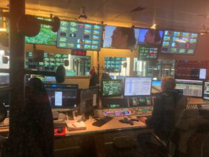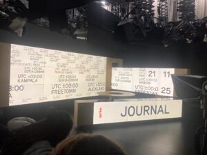 Nach der Präsentation gab uns Nicolas Beckers eine exklusive Führung „hinter die Kulissen“ des Kultursenders. Besonders spannend waren die zahlreichen, modern ausgestatteten Tonstudios und Dolmetschkabinen. Hier werden Tonspuren und Verdolmetschungen teilweise in der Nachbearbeitung eingesprochen, die meisten Ausstrahlungen und Live-Sendungen werden aber simultan verdolmetscht, was laut Beckers eine zwar stressige, aber vor allen Dingen abwechslungsreiche und spannende Aufgabe ist. Neben den Räumen zur Sprachbearbeitung durften wir auch in den verschiedenen Technik- und Regieräumen sowie in den beeindruckenden Studios vorbeischauen, in denen unter anderem das ARTE Journal täglich produziert und live aufgezeichnet wird. Während der Führung begegneten wir vielen Mitarbeitenden des Senders und bekamen hautnah mit, wie aufregend und anspruchsvoll der Tagesablauf bei einem so großen Sender ist.